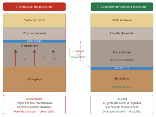 La position du géotextile est critique. Le placer entre la fondation et la couche intermédiaire — et non sous l'enrochement — constitue une erreur technique dont les conséquences se manifestent à moyen terme : l'argile migre vers le haut, colmate les couches drainantes et détruit la planéité de l'ensemble.